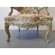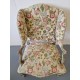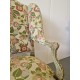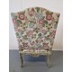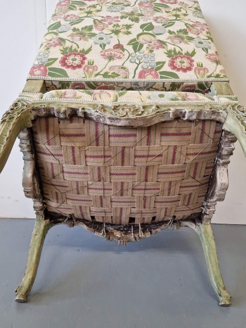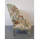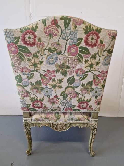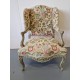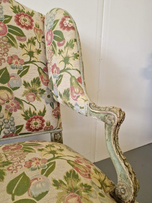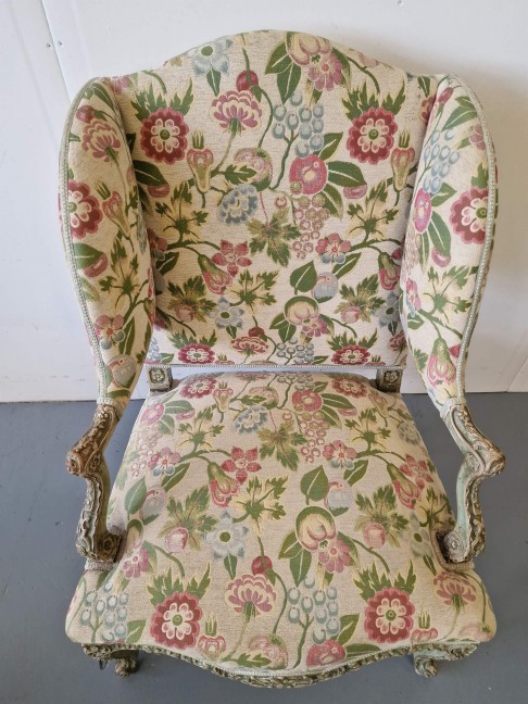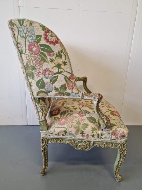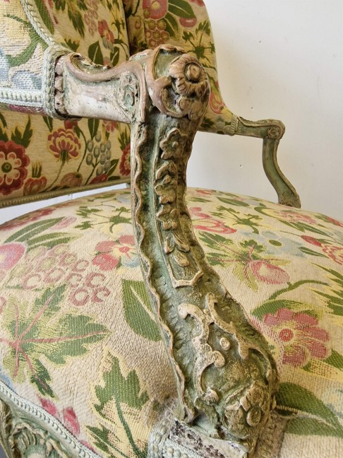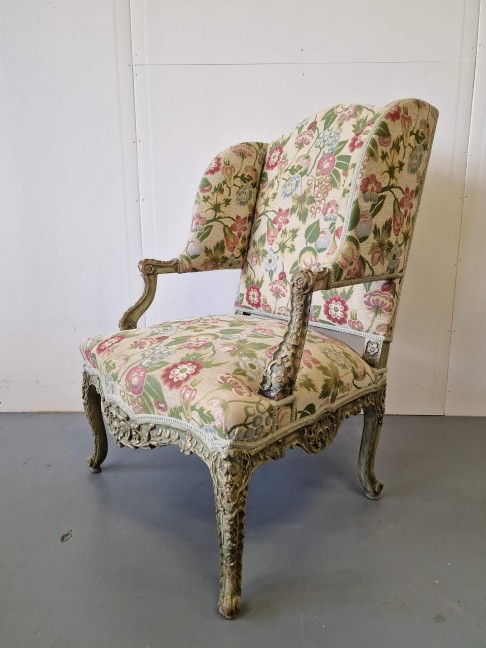 Antikvārs atpūtas krēsls ar detalizētiem kokgriezumiem.