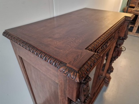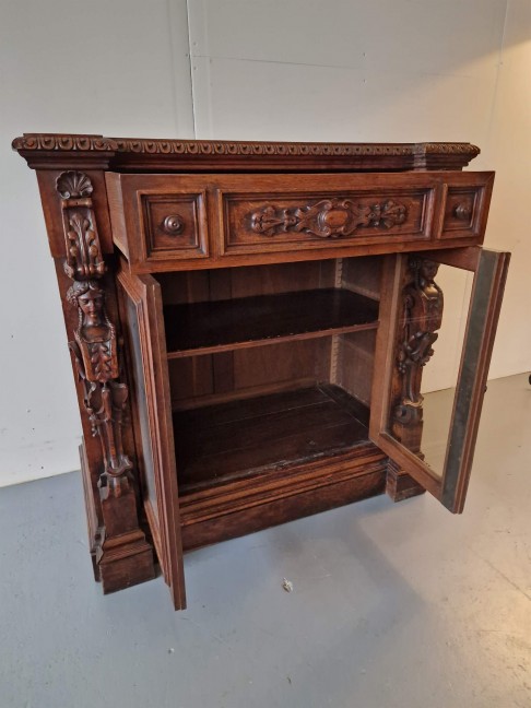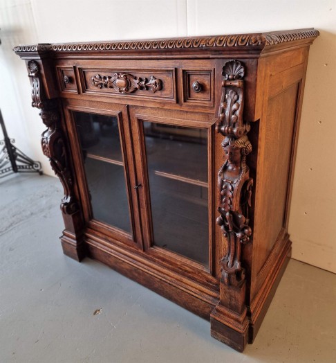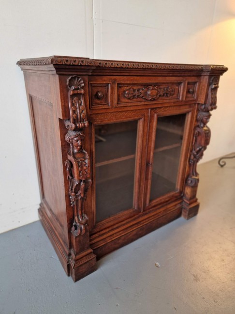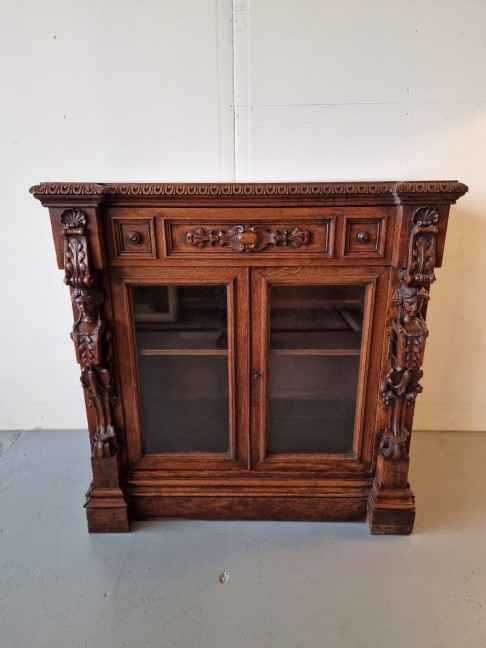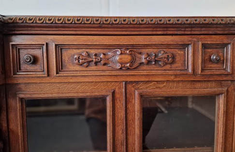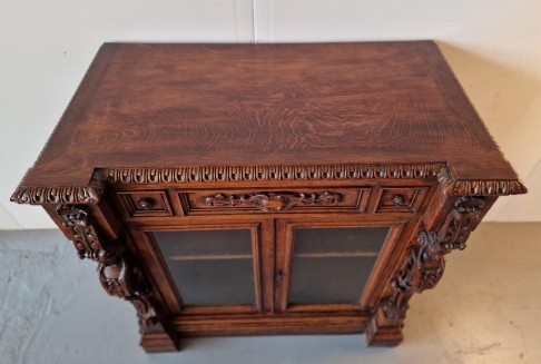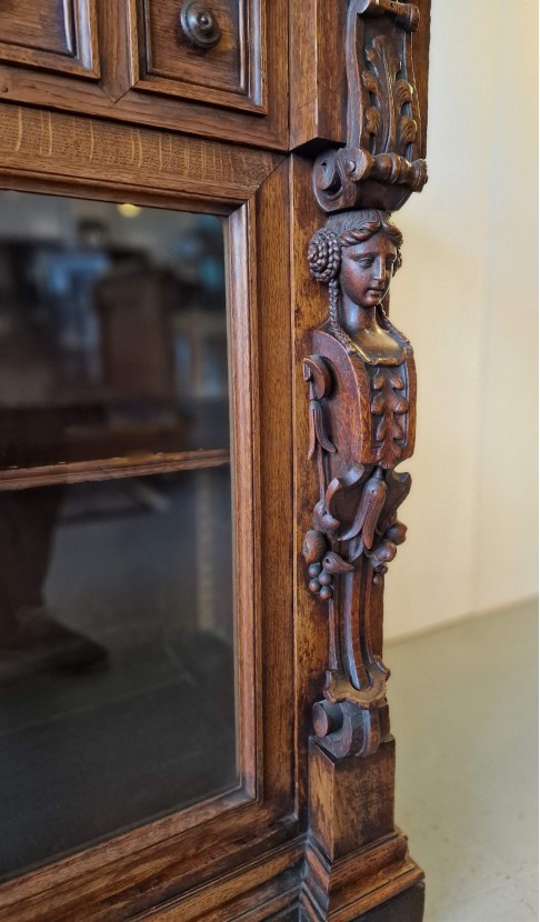 Renesanses stila vitrīna ar zicili skaistiem kokgriezumiem.